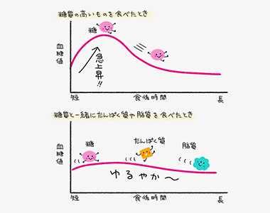 例えば、糖質の高いクッキーが食べたいときは、たんぱく質と脂質を含む牛乳を合わせると血糖値の急上昇を抑えられます。