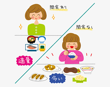 もし、食事の間隔が6~7時間以上になる時は、おやつなどの間食を摂ることをオススメします。間食を摂ることで、次の食事の量が抑えられ、食べ過ぎを防ぐことができます。また、おやつは上手に選んで食べることで、栄養補給にもなります。